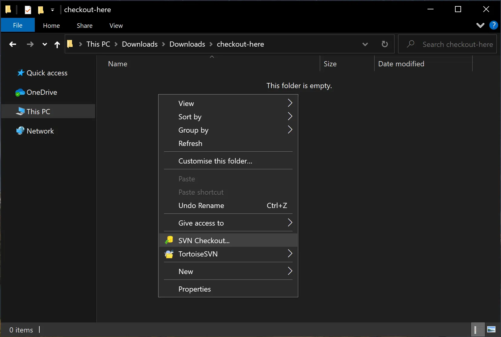 After installation is completed, you will see that the Explorer context menu has SVN Checkout and TortoiseSVN items added. Once we are done, you can remove this clutter from your context menu in the TortoiseSVN settings, which can be launched by typing the following in the command line. We need to keep it for now, though.