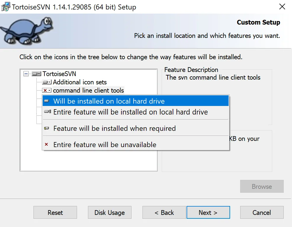 You can download and install TortoiseSVN from TortoiseSVN website. Make sure the option Command Line Tools is checked during installation as shown below.