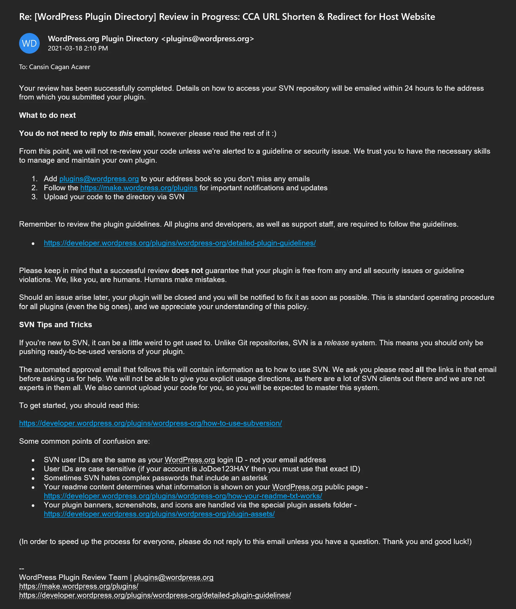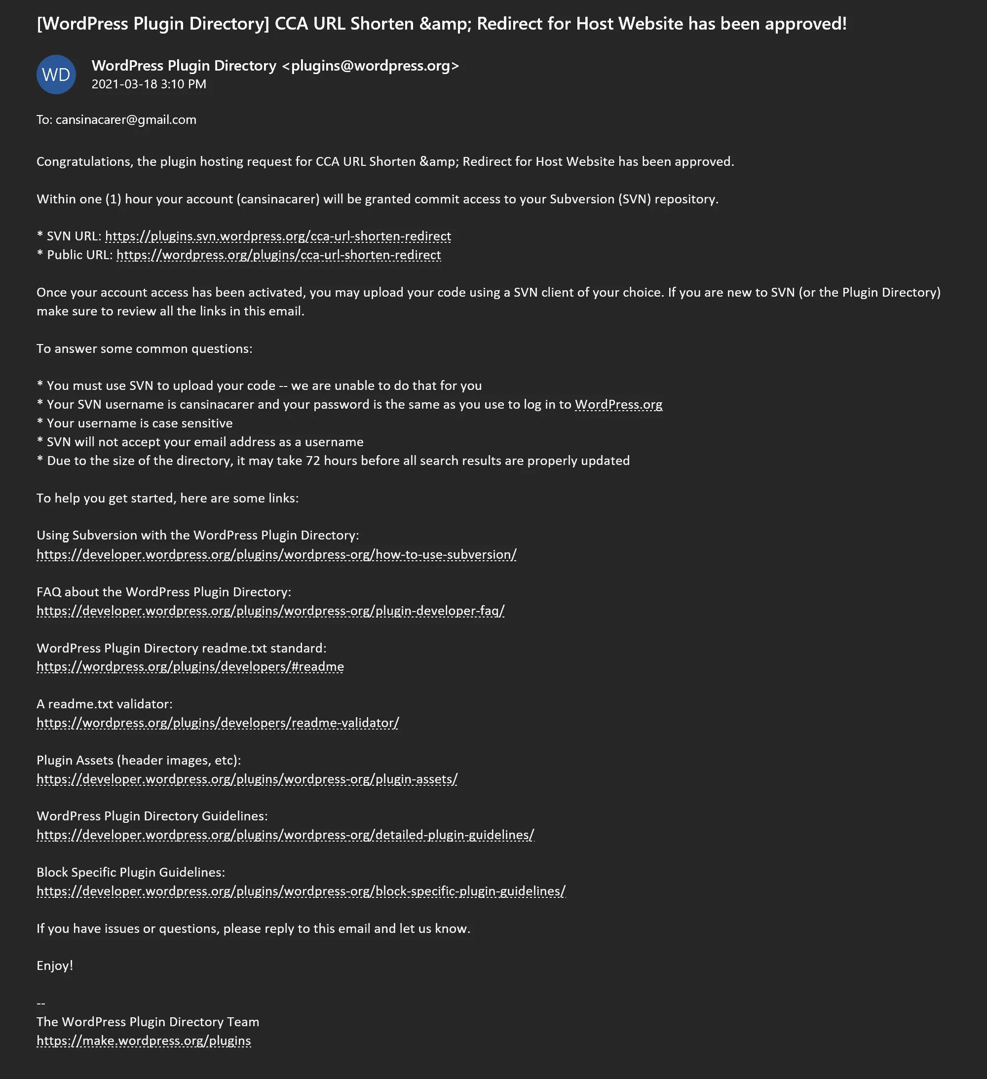 First, you need to make sure your plugin follows these guidelines; the important most one is to have a readme.txt file in the correct format since that populates the content of your plugin page. Online readme generator for Wordpress plugins or the readme.txt validator are useful for creating your readme.txt. Then, upload your plugin here as a zip package. After it is reviewed and approved, you will receive two emails with the links to your SVN URL and the plugin URL, as the ones below.